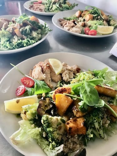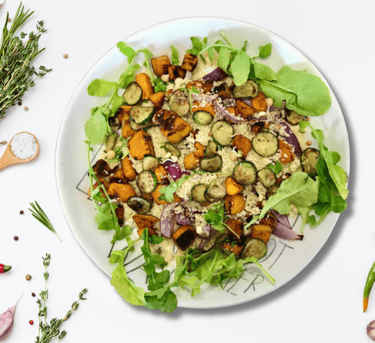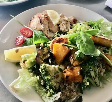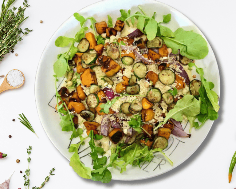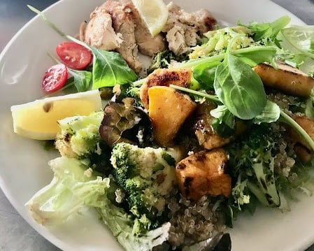 ancient grains, grilled veg, chickpeas, tomato, onion, mix leaves, avo ( seasonal )